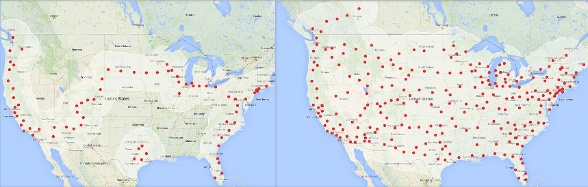 In other automotive news, Tesla Motors (TSLA 0.45%) proved it's beginning to overcome consumers' "range anxiety" by completing a 76-hour, cross-country trip in its popular Model S electric vehicle. It should be noted that currently you don't have too many options for a cross-country trip; however, compare the next two images to better understand how quickly one of Tesla's supercharger stations could be coming to an area near you by 2015.