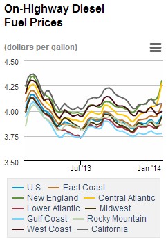While gas prices dipped slightly, diesel prices headed higher, with a $0.047 gain over the past week to $3.951 per gallon. Despite the price hike, this latest price tag still puts diesel $0.071 per gallon cheaper the same time last year. Whereas East Coast gasoline prices fell the most this past week, the region's diesel prices headed highest ($0.074). In the Rocky Mountains, diesel prices made the only dip, down a slight $0.003 per gallon.