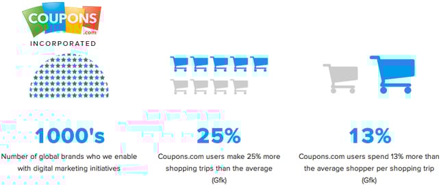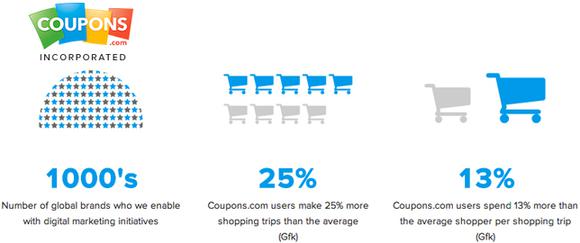 Notice that, unlike most e-commerce players, Coupons.com makes money when a customer downloads a coupon for redemption at a grocer or physical retailer. In this way, Coupons.com acts as a complementary platform to traditional retailers, like Wal-Mart, which is one of Coupons.com's biggest partners.