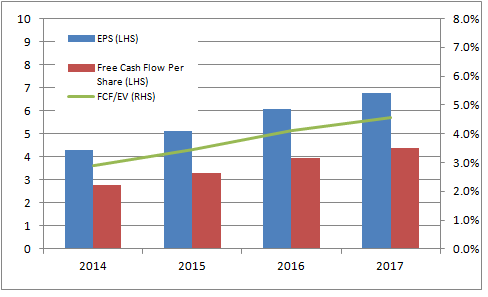 Assuming that 65% of earnings are converted into free cash flow on a long-term basis, and plugging in analyst estimates to 2017, gives the following estimate of its free cash flow. Its current share price is $79.4 with an equivalent enterprise value (market cap plus debt), or EV, of $96.