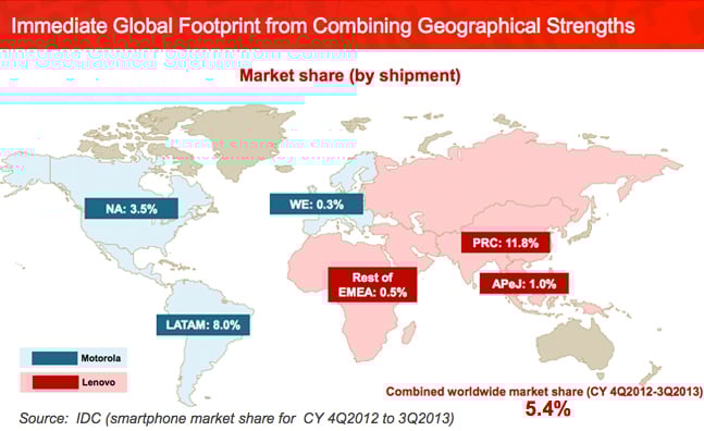 Still, Lenovo's market share for the fourth quarter of 2013 was only 4.9%, well below Samsung's 28.8% and Apple's 17.9%. Moreover, most of Lenovo's customers are concentrated in China.