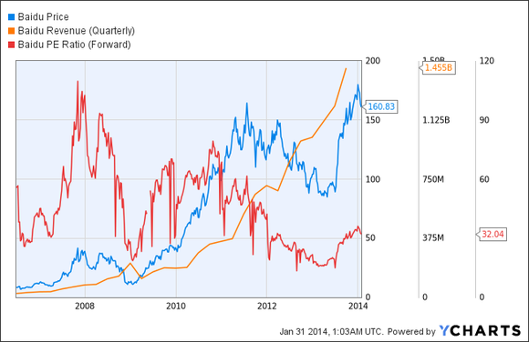 In addition to its nascent monetization of mobile, Baidu also has spectacular revenue growth of 42%, reported in Q3 2013 from one-year earlier. As a Chinese tech stock, Baidu is certainly a high-risk venture, but at around 30 times forward earnings, buyers aren't paying much for supercharged growth. As can be seen in the chart below, revenue growth has remained strong, while the earnings multiple remains low.