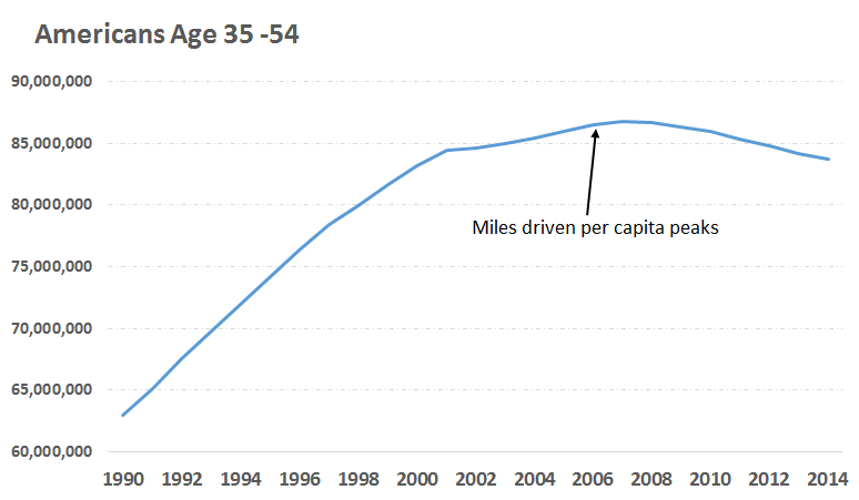 That's a critical difference, because after rising for decades, the number of prime-driving age Americans plunged by 2.8 million over the last eight years as baby boomers age into their 60s. The number of prime-age drivers peaked at the exact time miles driven per capita peaked: