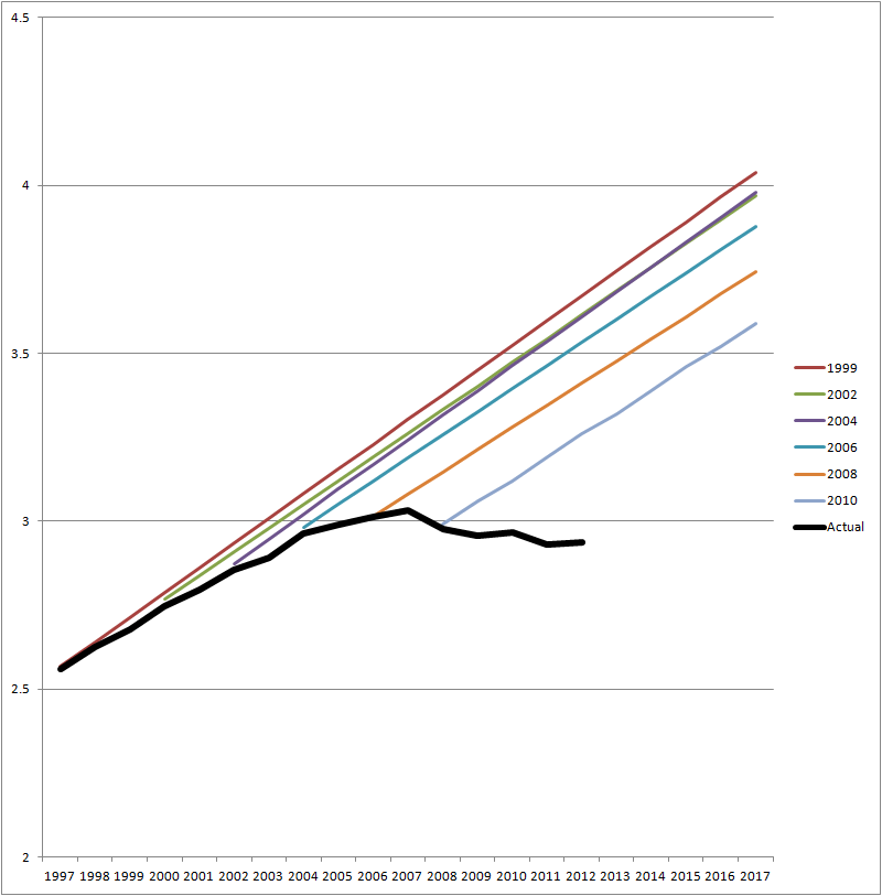 Not only is this decline unprecedented, but it was totally unforeseen. In one amusing display of how off the nation's best traffic forecasters (it's an actual job) have been, Eric Sundquist of the State Smart Transportation Initiative showed the Department of Transpiration's recent forecasts of miles driven compared to what actually occurred: