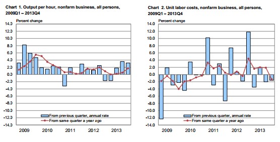 Nonfarm business sector labor productivity increased an annualized 3.2% for 2013's fourth quarter, driven ahead primarily by a 4.9% Q/Q increase in nonfarm output and a 1.7% increase in hours worked. After rising a revised 3.6% in Q3 2013, analysts had expected a more subdued 2.6% improvement.