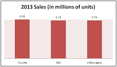 Investors should also take heart from the company's steady sales growth. In 2013, Toyota beat rivals GM and Volkswagen to retain the global sales crown. The sales tally stands as follows: