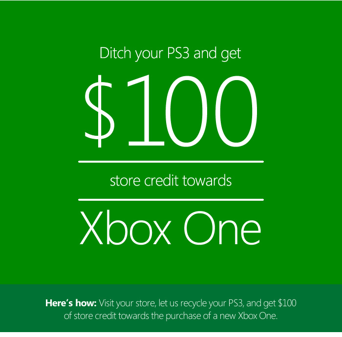 Gamers who don't want an Xbox One can simply go to GameStop and trade in their used PS3 systems for $100 in store credit to reduce the price of a new PS4 to $299 instead.