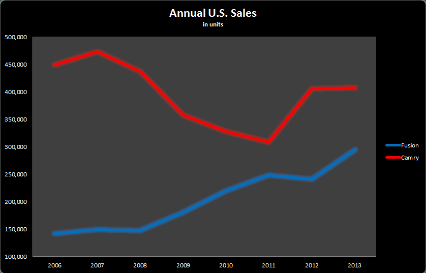 Toyota's Camry has long been king of a key American vehicle segment: mid-size sedans. It's a segment that boasts incredible sales with fierce competition between many models that offer great fuel economy and solid value -- something Detroit automakers haven't always been known for. A decade ago, Ford was as close to competing with Toyota's Camry as I am to competing with Usain Bolt. Not very close at all. However, Ford redesigned its Fusion under its new "One Ford" strategy that focused on improving quality, fuel economy, and appearance. The result was stunning, and sales quickly took a bite out of the Camry's success.