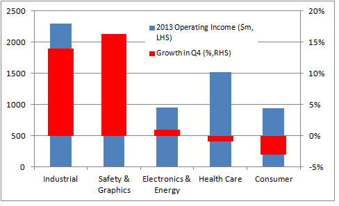 Interestingly, the electronics and energy segment is expected to grow at 2%-6% this year, pretty much in line with the overall company guidance of 3%-6% in sales growth. 3M's plans involve shifting revenue toward energy within the segment. Safety and graphics is doing well and may see some upside if commercial construction improves in 2014, while consumer revenue was up against a tough comparison of 9% organic growth in 2012.