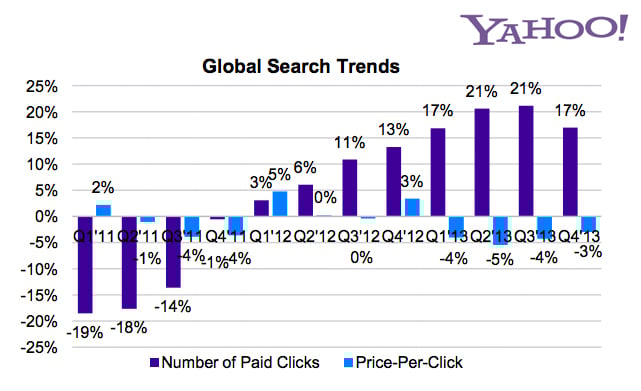 To make matters worse, in the past few quarters, Yahoo! has experienced decreasing rates in the number of paid clicks, price per click, and price per ad sold in its search engine business unit. Moreover, despite the decrease in price per ad sold, the number of ads sold has not seen a meaningful increase in the past two years. It increased by 3% in the latest quarter. According to comScore, Yahoo!'s share in the U.S. search market fell 0.4% from November to December.