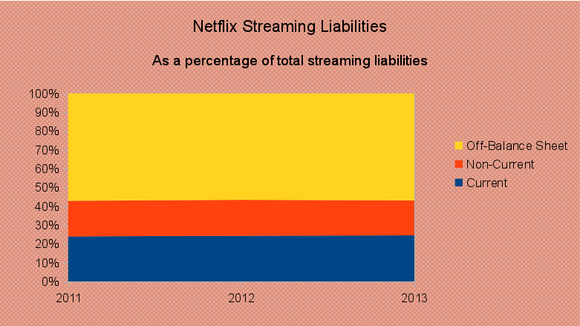That's right. In each of the last three years, Netflix has classified 24% of its total content obligations as current liabilities and 19% as noncurrent, with 57% staying off the balance sheet.
