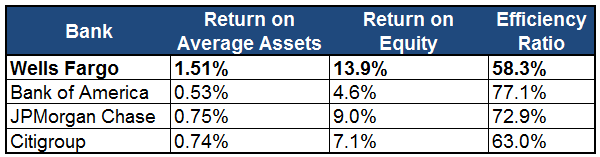 Again Wells Fargo eclipsed its three biggest peers of JPMorgan Chase, Bank of America (BAC +0.13%), and Citigroup (C +1.01%) in almost every pertinent profitability measure: