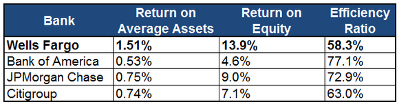 Again Wells Fargo eclipsed its three biggest peers of JPMorgan Chase, Bank of America (BAC 0.49%), and Citigroup (C 0.37%) in almost every pertinent profitability measure: