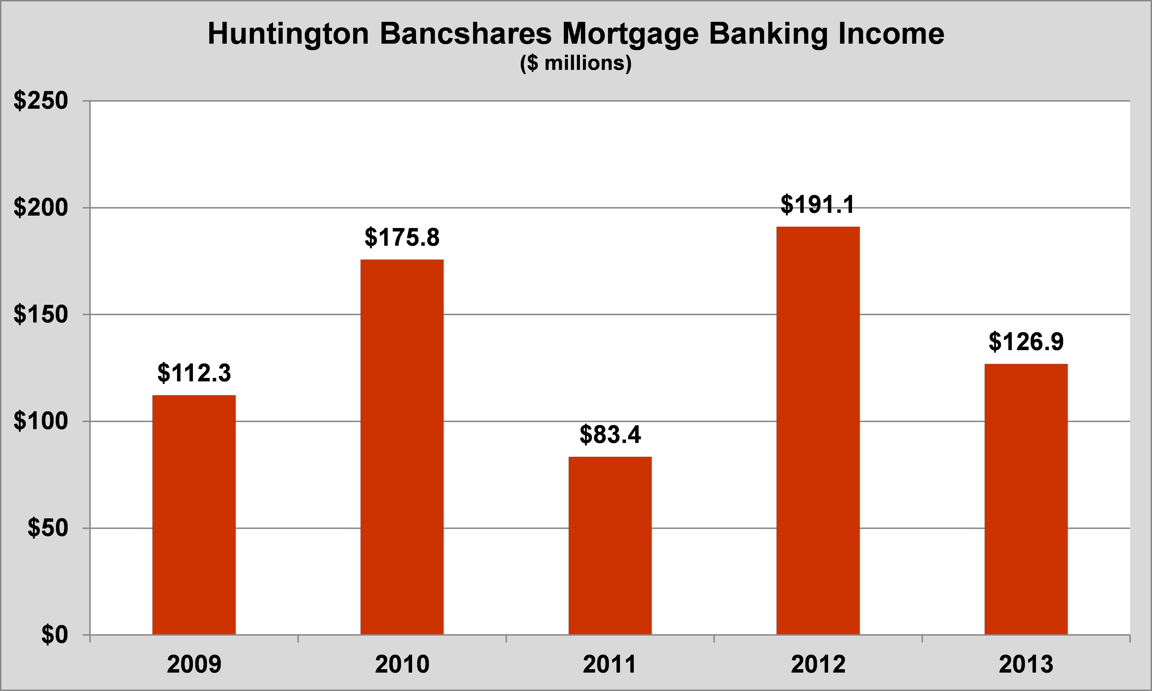 Yet buried at the bottom of its earnings release Huntington shows the biggest reason for its drop in income resulted from its mortgage banking operations, where income plummeted by 34%, or nearly $64 million in 2013:
