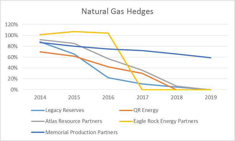 This first chart shows how much of Eagle Rock's natural gas production is hedged relative to its closest peers; notice that more than 100% of its natural gas production is currently hedged. This suggests the company is likely to add natural gas production either organically or through acquisition in order to bring that back into balance. The other important item to note is how natural gas-heavy peer Atlas Resource Partners isn't as well hedged on its top commodity. While that leaves the company open to upside if prices rise, a reversal in natural gas prices could make the company's move into natural gas backfire.