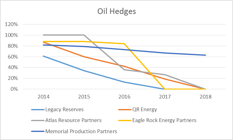 This last chart shows again how conservatively hedged Eagle Rock's oil is relative to its peers. The company's hedges run longer and for a higher duration than most of its peers. This is especially true when looking at oil-rich QR Energy. Falling oil prices could hurt QR Energy in the future as it hedges a much lower percentage of its volume than Eagle Rock.