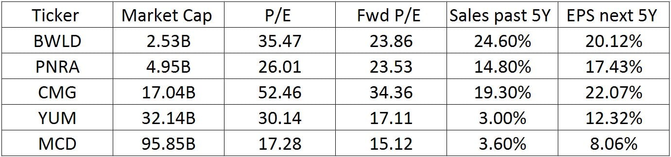 When comparing valuation ratios like forward P/E, Buffalo Wild Wings and Panera trade at similar valuations, but Buffalo Wild Wings is generating superior performance and has a higher forecast growth rate for the next five years. As for Yum! Brands and McDonald's, they are materially cheaper than Buffalo Wild Wings, but they are no match when it comes to growth potential.