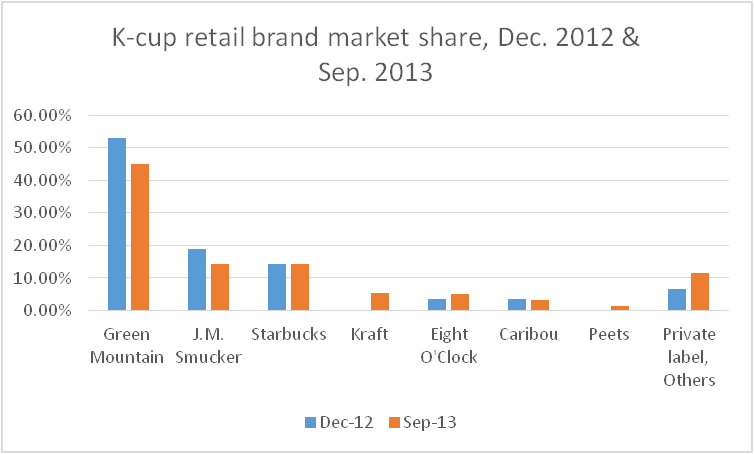 Green Mountain Coffee Roasters makes most of its money from the K-Cup pods, not from the actual brewers. In the company's first-quarter report, the packs segment accounted for more than 67% of total revenue after a year-over-year sales growth of 8% compared to a 1% loss for brewers. But Green Mountain has slowly lost market share since its K-Cup patent expired in September 2012.