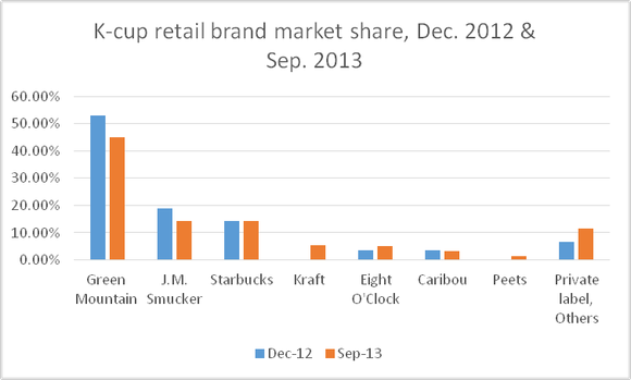 Green Mountain knew that private-label offerings would explode once the K-Cup patent expired. That's why the company has focused on locking in big brand names to long-term, exclusive contracts. As shown in the chart above, Green Mountain has licensing deals with J.M. Smucker, Starbucks, Eight O'Clock, and Caribou. So the company was involved with nearly 80% of the K-cups on the market in September 2013.