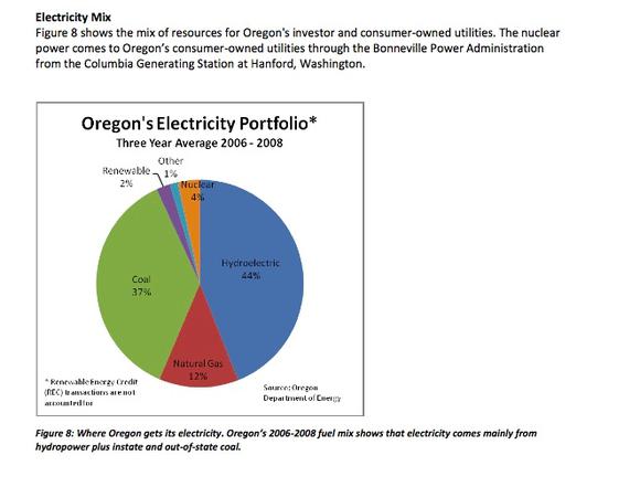 But ironically, even with such a green energy plan laid, "Oregon imports much of its electricity from Montana and Wyoming coal-fired power plants."As of May 2011, Oregon had 2,104 MW of wind power online, ranking it 7th in the nation, and deriving a proportional 7.1% of its electricity from wind. In 2007, Oregon required its largest electric utilities (PacifiCorp, Portland General Electric, and the Eugene Water and Electric Board) to ensure 5% of its retail electricity was renewable by 2011, and Oregon has met this standard. The requirement increases to 15 percent by 2015, 20 percent by 2020, and 25 percent by 2025.
