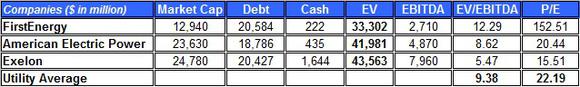 Let's examine FirstEnergy, American Electric Power, and Exelon's enterprise value-to-EBITDA ratios. One reason for using this metric is their different levels of debt. For example, FirstEnergy's debt-to-equity ratio is 1.6, while American Electric Power has a debt-to-equity ratio of 1.2, and Exelon's ratio is 0.9. Thus, FirstEnergy has the highest debt burden of the three. The enterprise value-to-EBITDA ratio takes this into account.