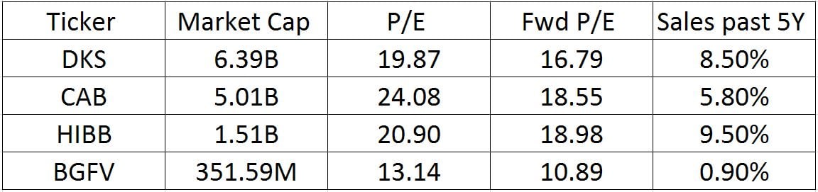 When compared against competitors such as Cabela's, Hibbett, and Big 5, Dick's Sporting Goods looks attractively valued. The company is a bit cheaper than Cabela's and Hibbett in terms of both P/E and forward P/E ratios. While Big 5 Sporting Goods is by a considerable margin the cheapest one in the group, the company is also clearly underperforming its competitors.