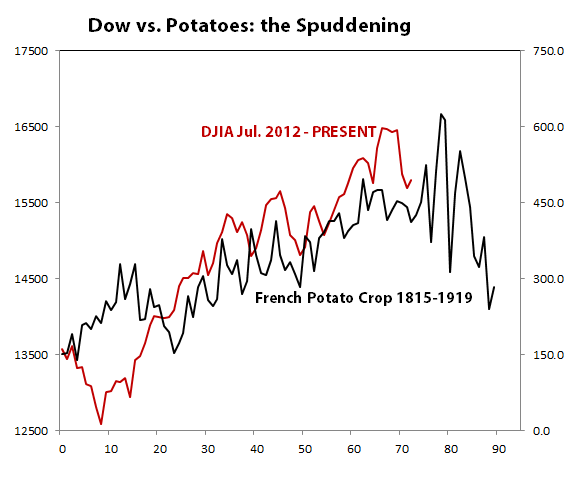 What do these three charts have in common? They should all be completely meaningless to rational investors, because none of them show two variables that are actually related to each other. Sure, the first chart seems compelling at first glance, because humans are visual creatures. Look at that scary chart! Doesn't the Dow look like it's doing the same thing it did in 1929? Sure it does, if you mangle your variables badly enough. But as has already been pointed out multiple times, the Dow really isn't following 1929's pattern -- you can see what's really happening over similar time frames on the second graph, which shows a far more modest gain in today's Dow than the wild surge that preceded the worst crash in history in 1929.