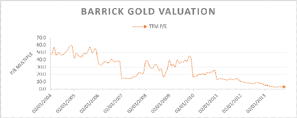 Meanwhile, so-called bottom fishers and value investors will argue that gold miners are trading at valuations lower than those seen in the midst of the financial crisis, or indeed at any point in the last decade. Barrick Gold, for example, has been trading at its lowest valuation in a decade for more than three years now. However, any investors who bought into the company based on this low valuation looking for a turnaround have been sorely disappointed.