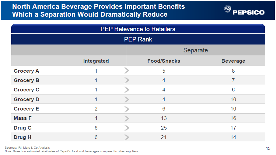 The most convincing case for keeping the two units together is on slide 15 of the conference-call presentation. It shows that PepsiCo is the largest supplier for its top-four grocery partners. If PepsiCo were to spin off its beverage business, its snacks business would become its partners' fourth-largest food supplier and its beverage business would be close to dropping out of the top-10 suppliers.