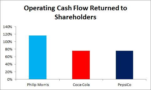 Coca-Cola and PepsiCo returned about three-fourths of their cash flow to shareholders. Philip Morris returned more than 100% of its cash flow because it borrowed money at low interest rates and gave it to shareholders. By adding debt to its balance sheet, Philip Morris effectively borrowed future cash flow and gave it to shareholders at present -- thereby increasing shareholder value.