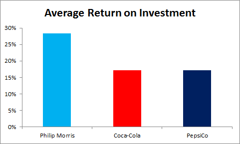 Philip Morris, Coca-Cola, and PepsiCo are so large that there are not enough high-return projects available to reinvest all of their cash flow. However, the projects in which they do invest have historically generated high returns. If you average each company's return on assets and return on invested capital since 2005, you find that Philip Morris generates a 28% return on investment and Coca-Cola and PepsiCo generate a 17% return on investment.