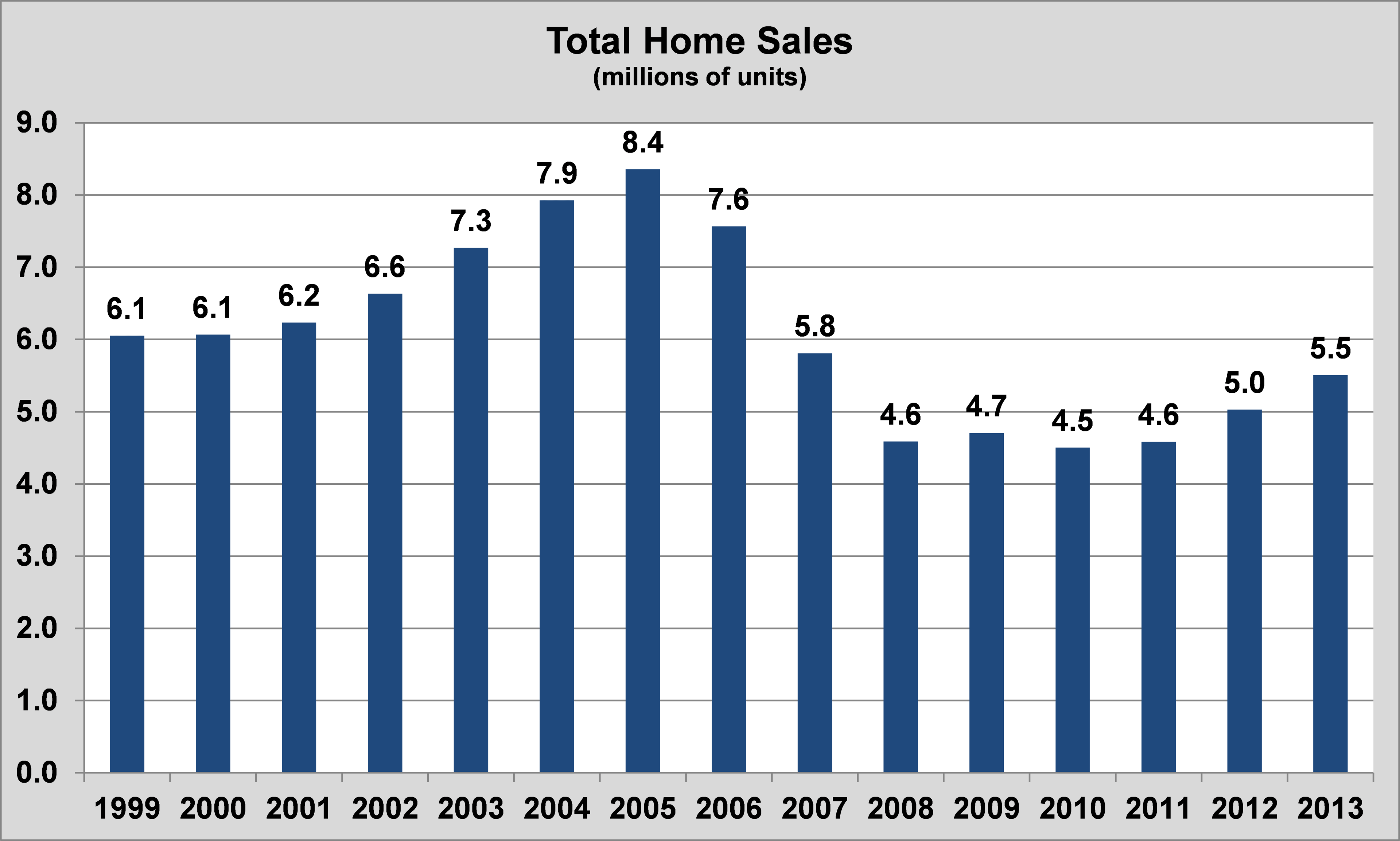 The latest data shows more than 5.5 million homes were sold in the U.S. in 2013. Total home sales rose 9.5% over 2012 levels, and new home sales registered an impressive 17.4% increase relative to last year. And, while total home sales are still below that level every year from 1999 to 2007, there is an undeniable reality the housing market is recovering four after years of floundering growth.