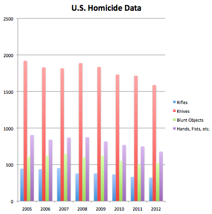 Despite its popularity and politicians' fixation on it, the rifle is used in fewer crimes than other more common household items, like knives or hammers. In fact, hands, fists, and feet are used in twice as many murders as rifles. Overall, violent crimes with guns have been on the decline for years, and the murder rate by guns is at its lowest point since at least 1981, according to FactCheck.org. And all of that is occurring as gun ownership has increased.
