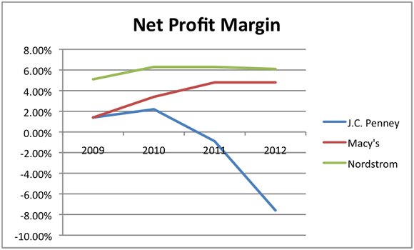 As a result of decreased sales, J.C. Penney's losses continued to mount. During Johnson's tenure, the retailer saw its net loss widen from $152 million to $985 million. In fact, the losses in its 2012 fiscal year were so bad that they brought the company's four-year average net profit margin down to -1.2%. Even after Johnson was ousted by the board and coupons were reinstated, the company continued to face difficulties. In the first three quarters of the year, it posted a loss of $1.4 billion.