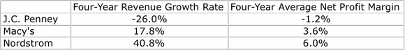 While it's possible that brick-and-mortar retailers are on their way out, Macy's and Nordstrom have been defying the odds. Over the past four years, Macy's has seen its revenue jump 18% from $23.5 billion to $27.7 billion. Although this may not seem impressive when placed next to a company like Groupon or LinkedIn, it's very strong when compared to retail rivals like J.C. Penney, Sears Holdings, or Aeropostale.