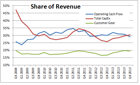 In its defense, Rackspace's management has outlined that 2013 was a year where it built excess capacity, and on the conference call, it argued that 2014 would see capex as a share of revenue come down "toward that 25% number."