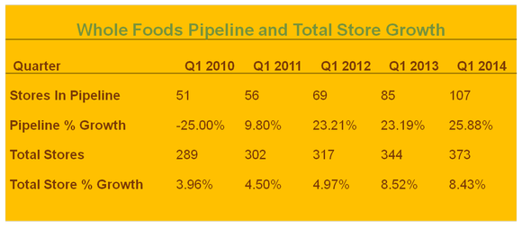 It took Whole Foods 30 years to reach the 289-store mark, in quarter one of 2010. But in the last four years, the company has added nearly a third more stores. Both the growth rate of new stores under development and growth rate of total stores have picked up aggressively over this period.
