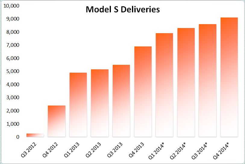 Source:Tesla press releases. * indicates quarterly estimate based on a scenario if Tesla hits 800 deliveries per week by late 2014.