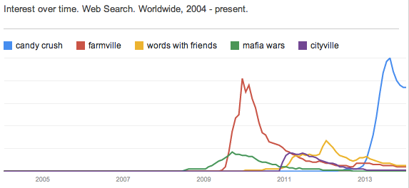 King Digital's darling is, of course, Candy Crush Saga, with 93 million daily active users. Its next most popular title, Pet Rescue Saga, only claims 15 million. Given the runaway success of Candy Crush, investors must ask if it can reliably repeat creating such a game, and if such a game will stay popular. Based on past popular titles, the popularity of top games doesn't last long -- at least according to Google Trends:
