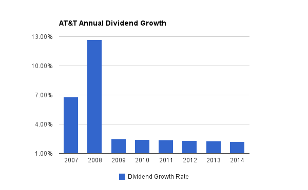 As you can see, prior to the Great Recession, AT&T raised its dividend by a significant amount. However, beginning in 2009, the company's annual dividend increase decelerated. With a 2.5% increase in 2009, the annual increase has declined sequentially each year to a low of a 2.2% in 2014.