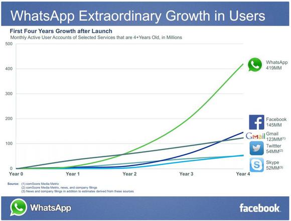 This chart, from Facebook's own presentation, illustrates the steep growth of WhatsApp over the past four years.