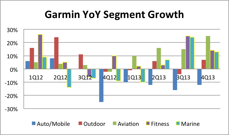 Fitness grew 14% to $119 million, based on strong holiday sales for the Forerunner running watches and the Edge Touring device for bicyclists. Garmin also launched the activity fitness band Vivofit and the forthcoming Vivoki.