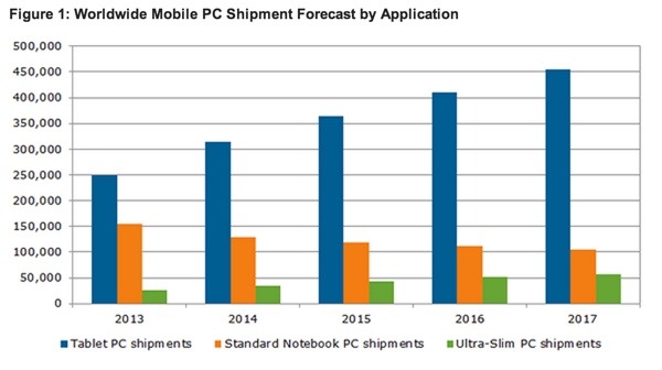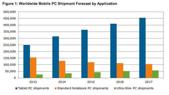 What does the future hold? According to more credible data, sales of tablets will actually grow dramatically over the next few years, while shipments of notebook PCs are projected to decline and those of ultra-slim devices will double. See Figure 1 below for a visual.