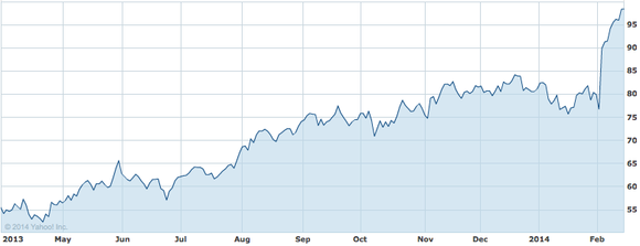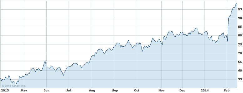 For the first nine months of fiscal 2014, Michael Kors' earnings per share increased 64.9% and revenue increased 51% from the same period a year ago. Comparable-stores sales have increased 27.3%, 22.9%, and 27.8% in the first three quarters respectively, resulting in a 26.2% growth overall. This is an absolutely incredible performance and it has been fueled by the growing popularity of the brand and the company's worldwide expansion. Here's the performance of Michael Kors' stock since the first day of fiscal 2014, March 31, 2013: