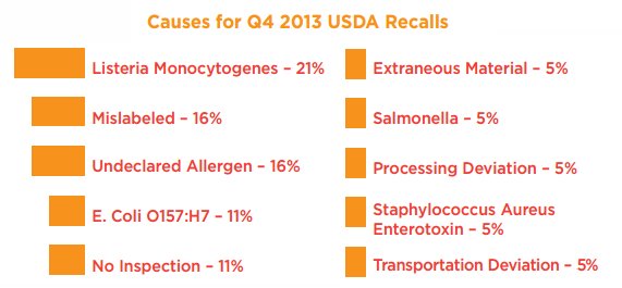 The number of food units recalled in the U.S. during the fourth quarter of 2013 rose 52% year-over-year to 10.6 million units, according to a recent report from Stericycle ExpertRecall. There were 19 recalls of meat, poultry, and processed egg products, for a total of 861,000 pounds of food. That's a disturbing increase from the first quarter of the year, when 450,000 pounds of food were recalled.