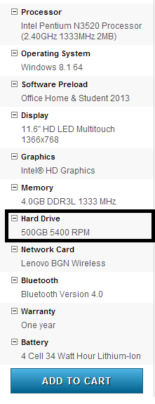 You'll notice that the system seems mostly compelling: a nice quad-core Pentium N3520, 4GB of RAM, and an 11.6-inch touchscreen. The fly in the proverbial ointment is the 500GB 5400-RPM hard disk drive. Contrary to popular belief, for everyday usage, the most dramatic impact on the PC experience doesn't come from the processor or the RAM, but from the storage subsystem. Indeed, solid-state drives make the system feel much faster. The trade-off is that the cost per gigabyte is much higher.