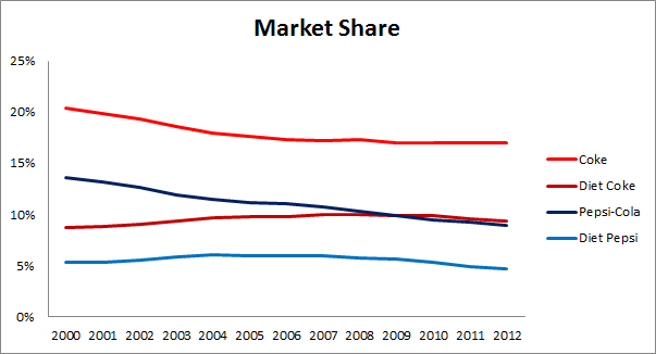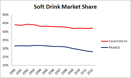 PepsiCo's decline in the soft drink market is made even clearer by measuring its overall market share. In 2006, PepsiCo had a 31.2% share of the market and Coca-Cola had a 42.9% share. By 2012, PepsiCo's share had declined by 3.1 percentage points to 28.1%, while Coca-Cola's share had declined by just 90 basis points to 42%.
