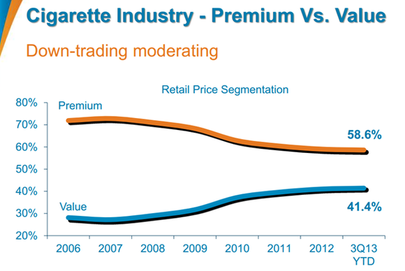 Data supplied by Reynolds shows the scale of this 'down-trading.' Within a recent shareholder presentation by Reynolds, the company notes that since 2006, the number of premium cigarettes sold as a percentage of the overall volume of cigarettes sold within the United States has declined from slightly more than 70% to only 58.6%. Meanwhile, the value segment of the market has expanded to 41.4% of the total market, up from slightly less than 30%.