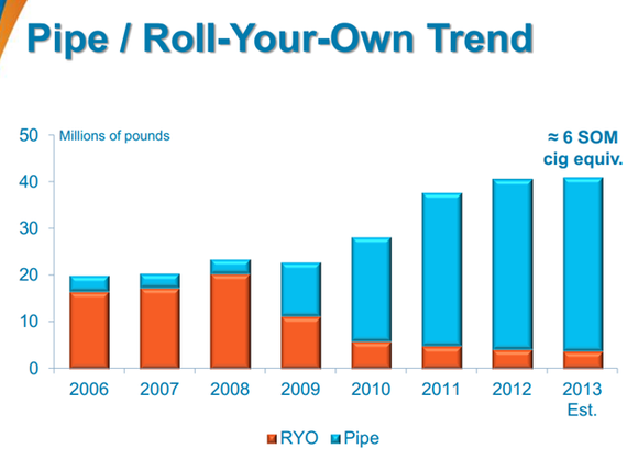 What's more, Reynolds reports that the market for pipe and roll-your-own tobacco, which is generally cheaper per equivalent cigarette, has exploded over the same period. Specifically, the annual sales of pipe and roll-your-own tobacco rose from 20 million pounds in 2006 to an estimated 41 million pounds for the full year of 2013.