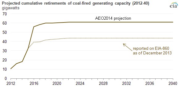 According to a recent report from the Energy Information Administration, more companies are going to cut more coal in the next three years. As early as 2015, utilities' estimates for coal-fired power plant retirements veer well below projections from the Administration's Annual Energy Outlook 2014.